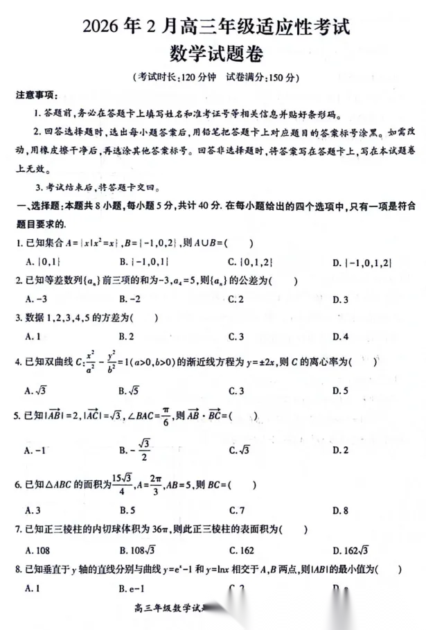 2026年2月高三年级适应性考试下载