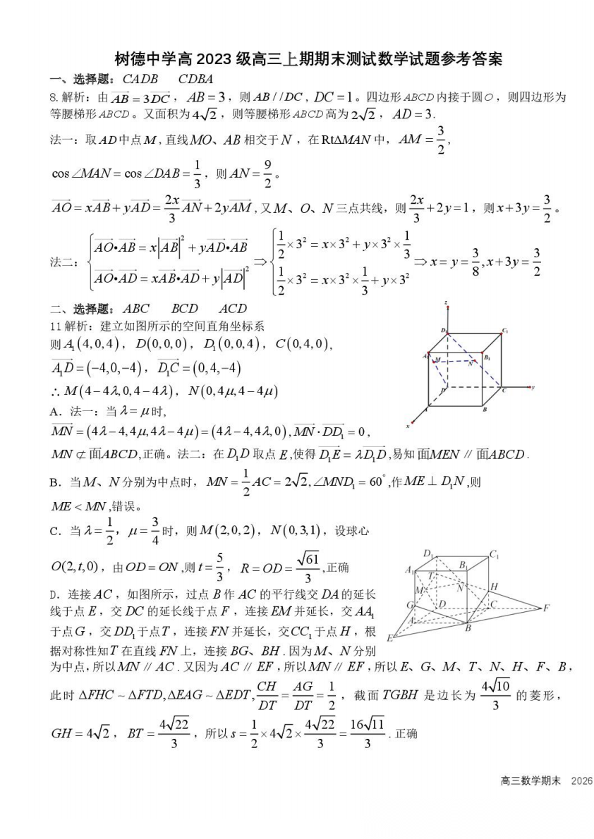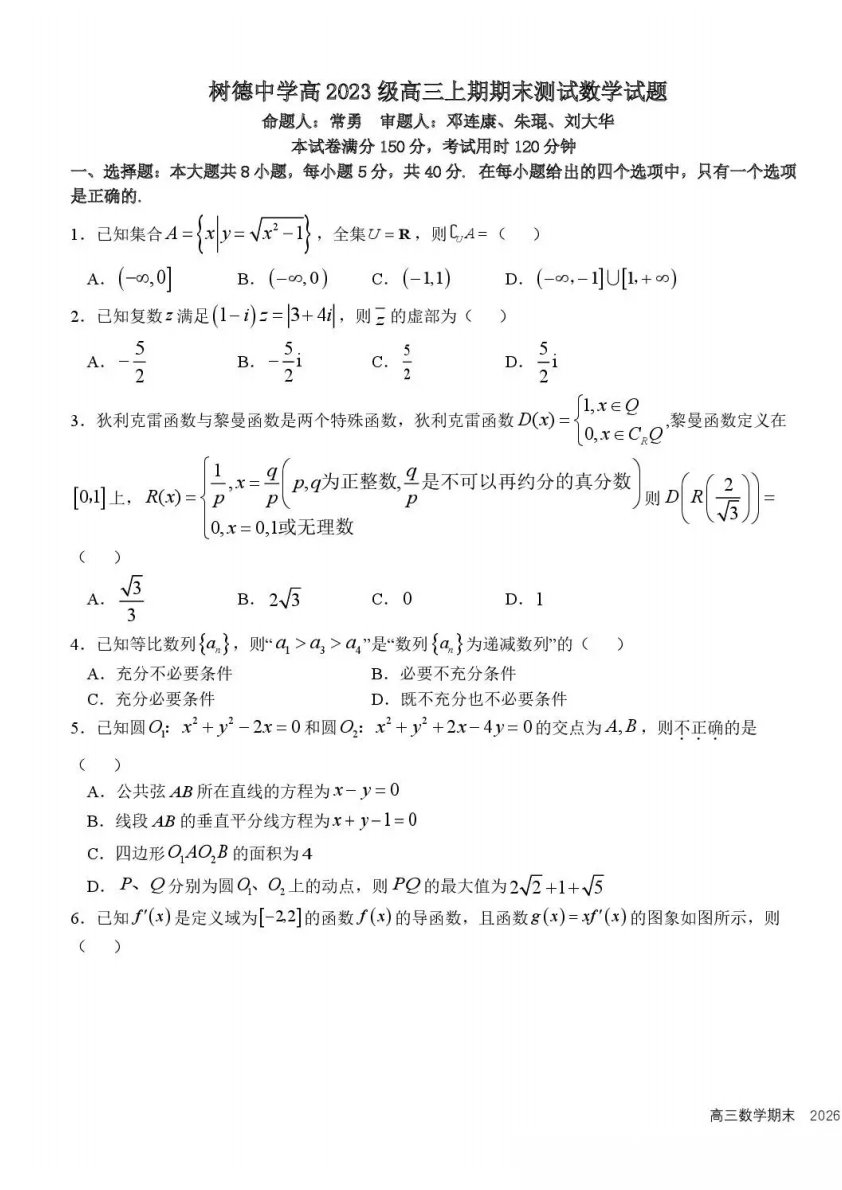 【全科】树德中学高2026届高三上学期期末测试