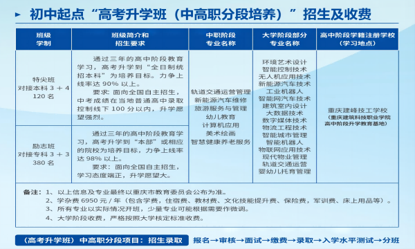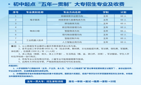 五年一贯制又称“初中起点大学专科教育”,是教育部人才培养模式改革重点项目,是中等教育与高等教育的贯通,招收参加中考达到相应录取分数线的应届初中毕业生,直接进入经教育部批准备案的大学学习。学制五年,高中(阶段)大学一起读。