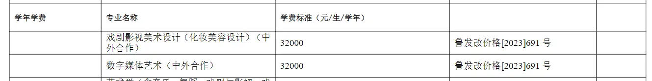 2024山东艺术学院中外合作办学专业学费为32000元/生/学年;住宿费:文东校区600元/生/学年,长清校区6人间1100元/生/学年、4人间1300元/生/学年。以下为大家整理的是各专业收费标准,希望对大家有所帮助,如有变动,以学校最新公布的信息为准。