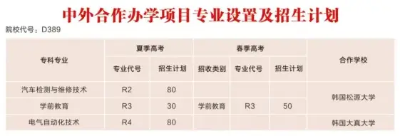 德州职业技术学院中外合作办学专业有汽车检测与维修技术、学前教育、电气自动化技术等,以下是具体名单一览表,供大家参考,由于专业设置可能会变动,正式填报时需要以学校最新公布的数据为准。
